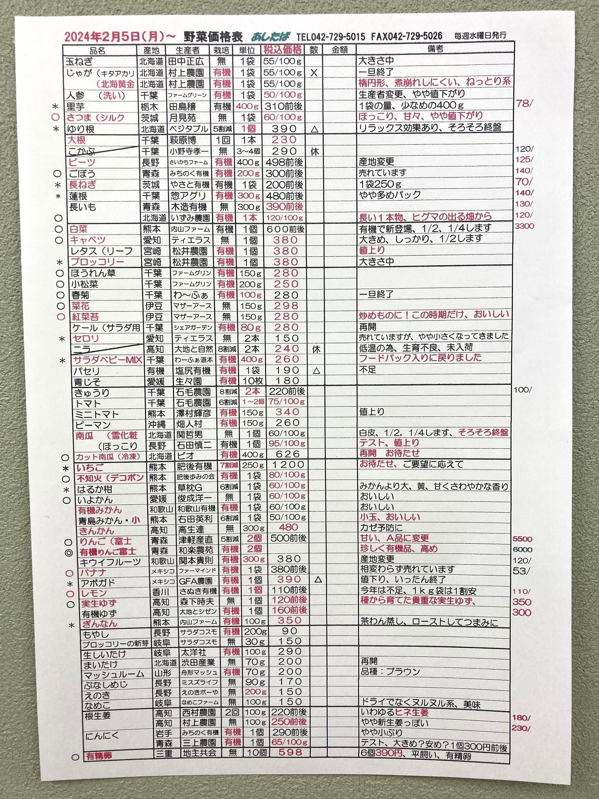 2月5日(月)〜の野菜入荷予定表です。