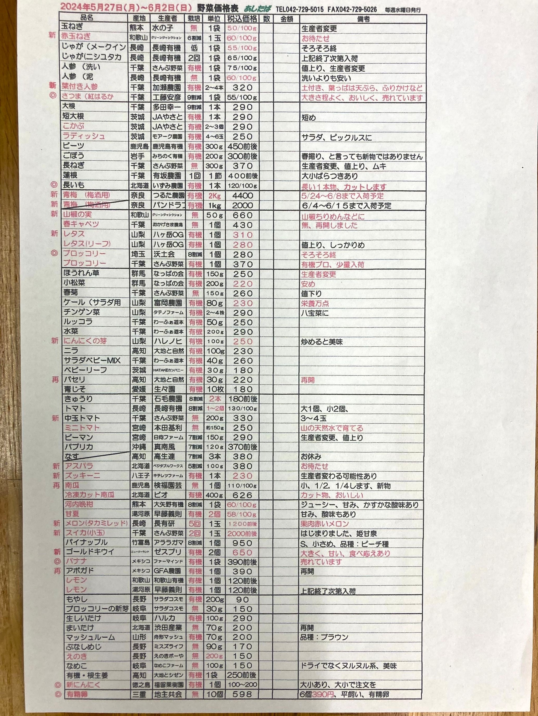 5/27(月)〜6/2(日)野菜入荷予定表です。
