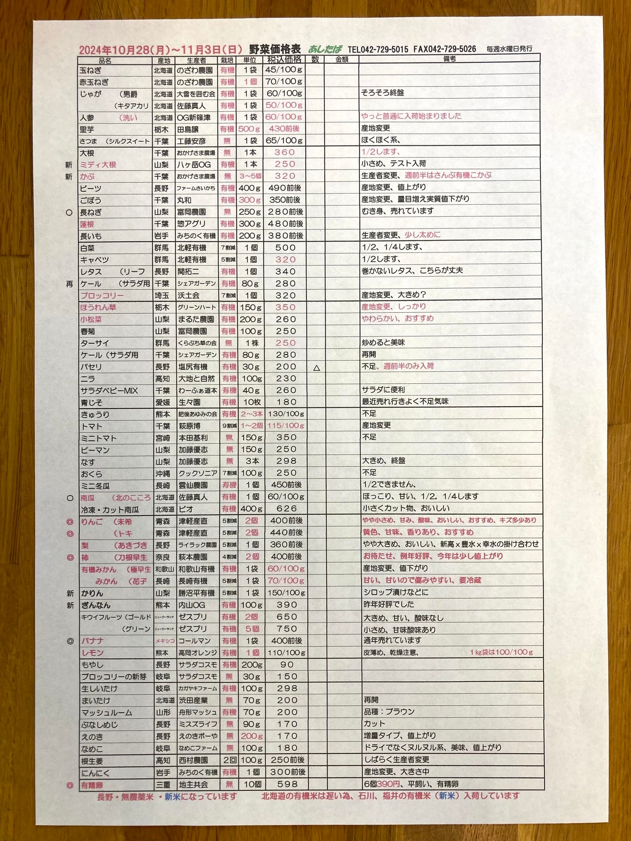 10/28(月)〜11/3(日)野菜入荷予定表です。