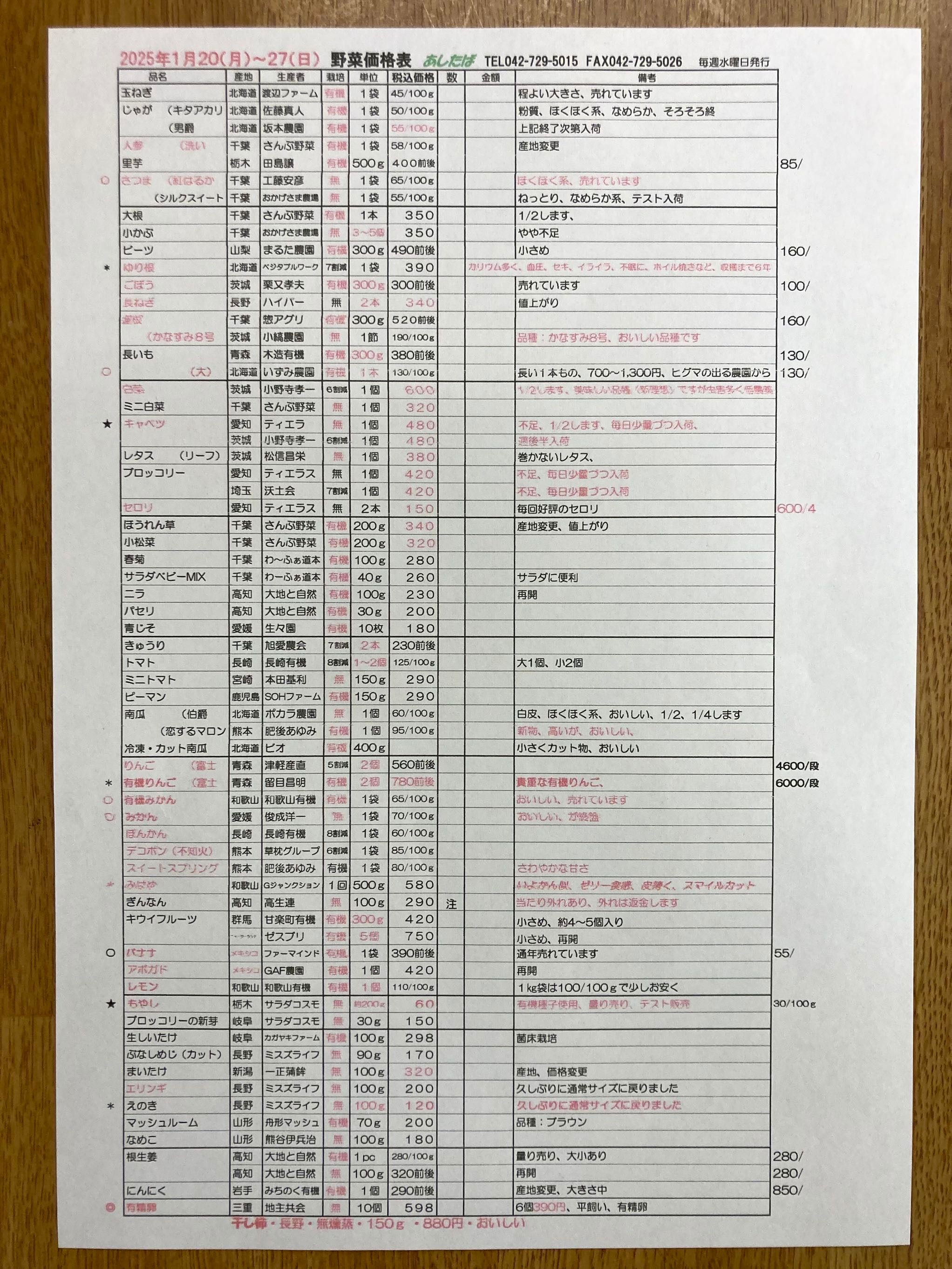 1/20(月)〜1/27(日)野菜入荷予定表です。