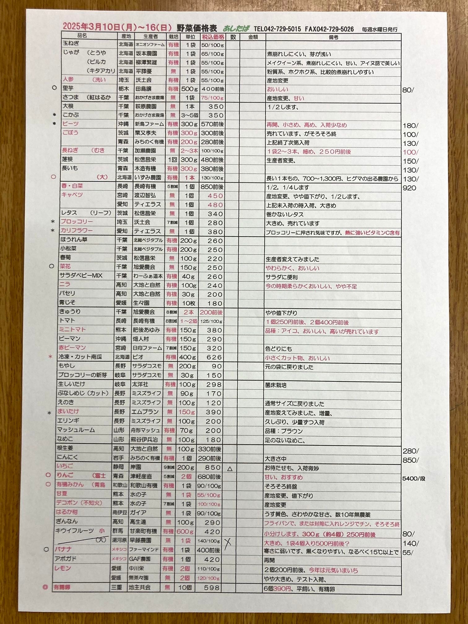 3/10(月)〜3/16(日)野菜入荷予定表です。