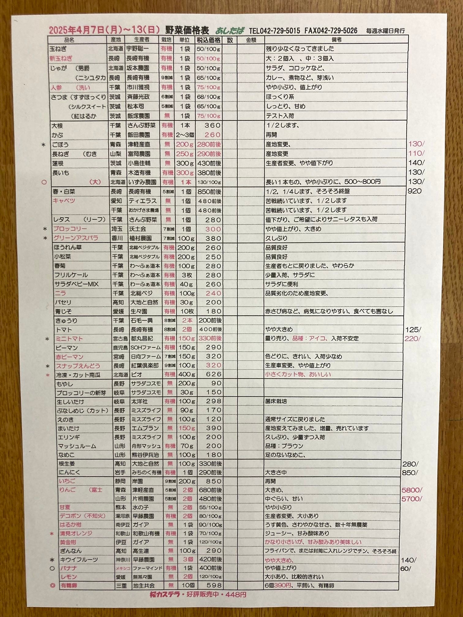 4/7(月)〜4/13(日)野菜入荷予定表です。