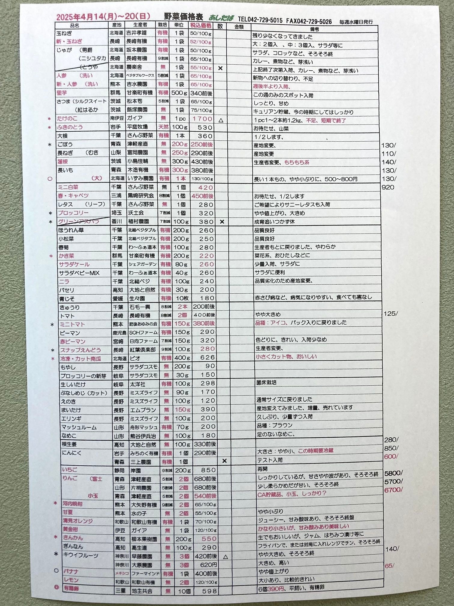 4/14(月)〜4/20(日)野菜入荷予定表です。