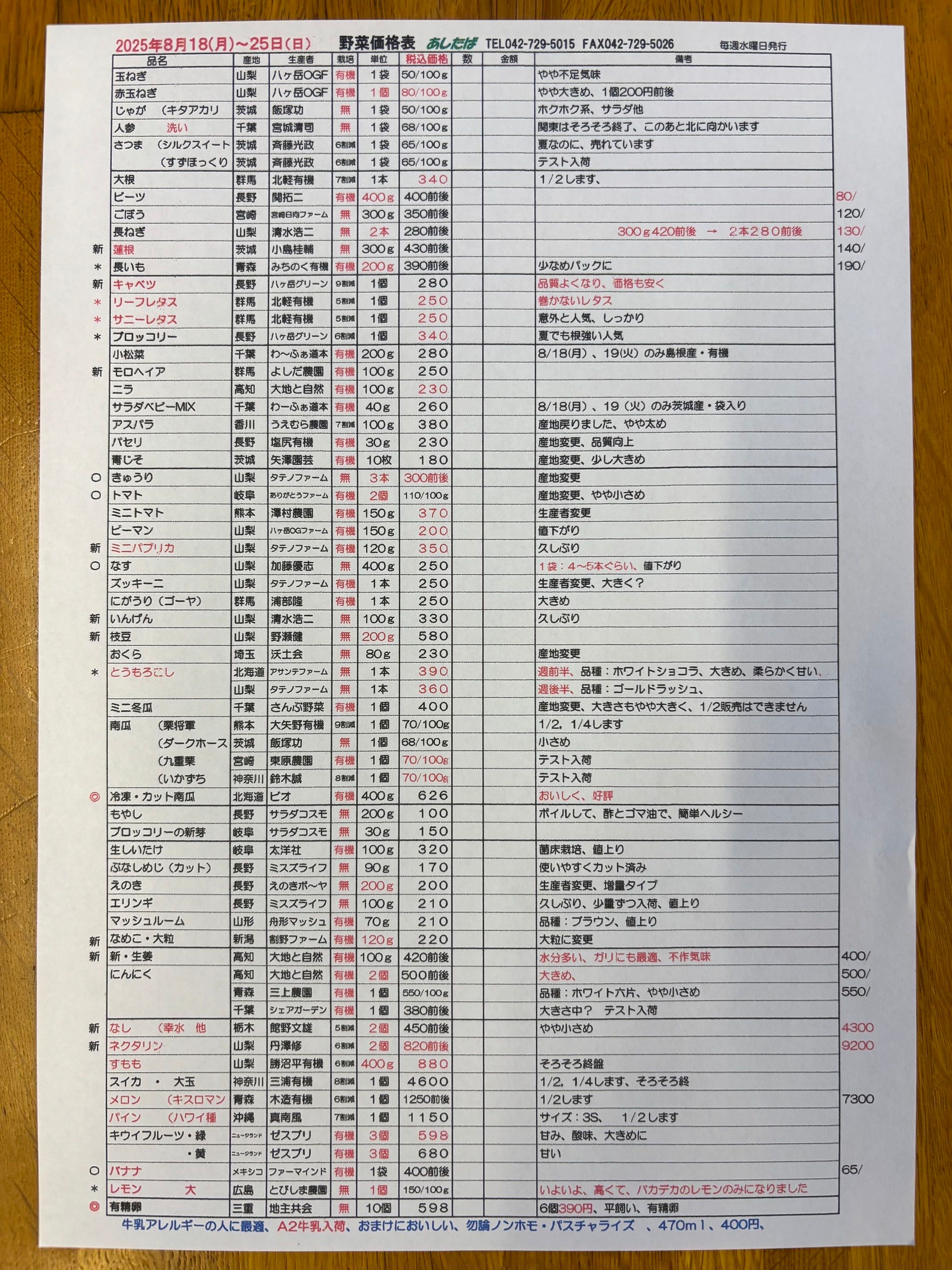 8/18(月)〜8/24(日)野菜入荷予定表です。