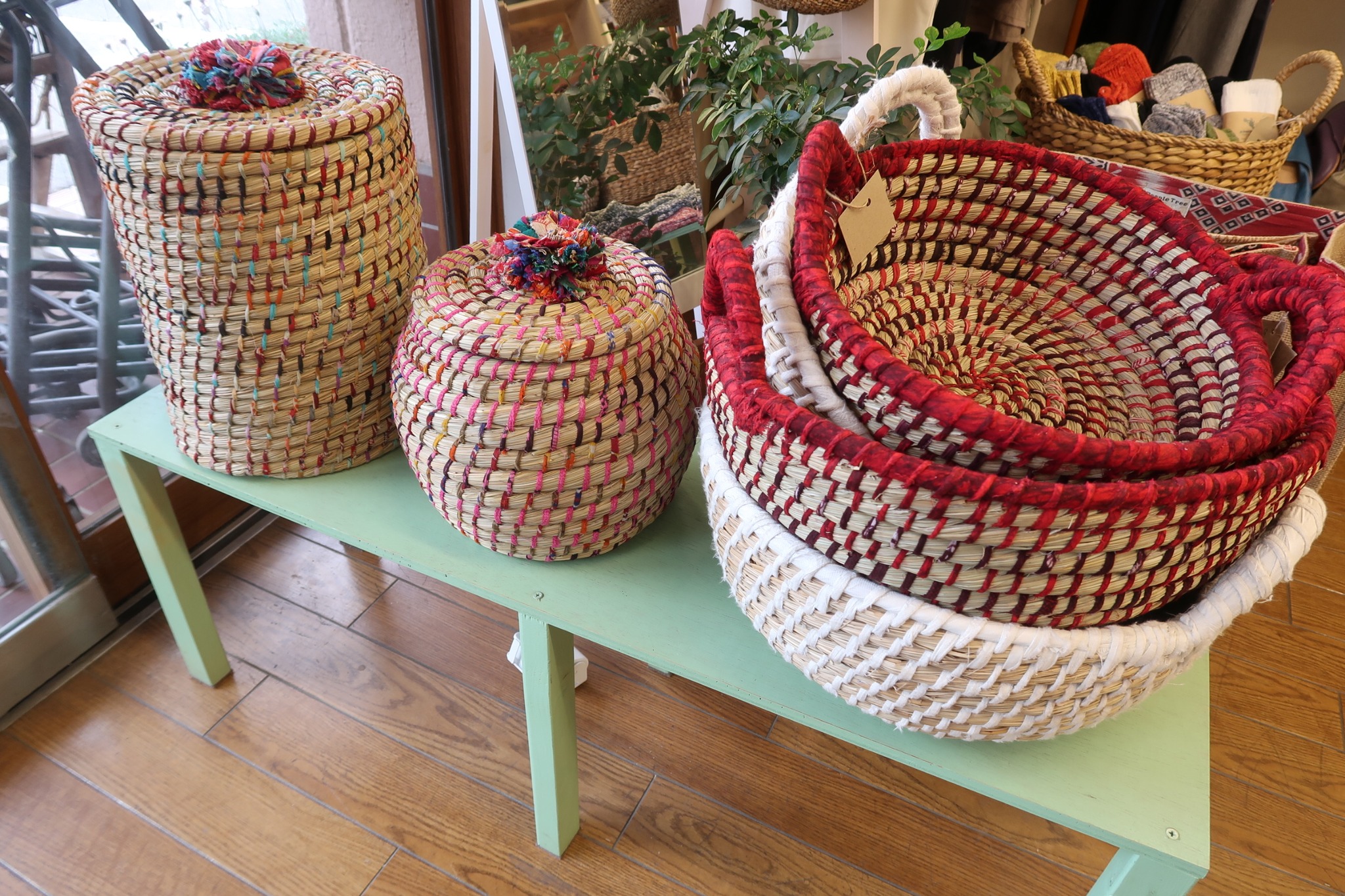 カラーのバスケットはリサイクルサリーを使っているので、一つ一つ表情に違いもあり個性的です。